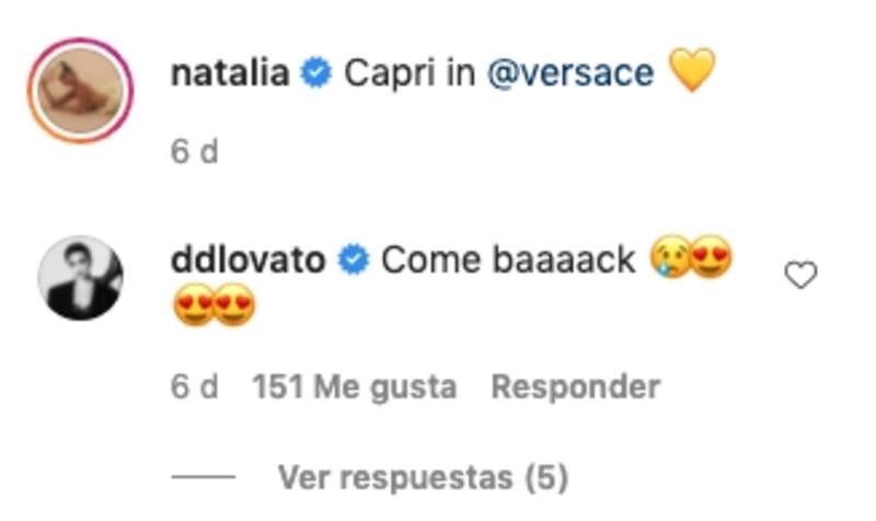 Solo unos días después de dicha publicación, Natalia Barulich volvió a poner una galería de fotografías, ahora en Capri, Italia, vistiendo un conjunto de la icónica marca Versace, que también fue comentada por Demi Lovato y un "Regresa" con emojis de caritas enamoradas.