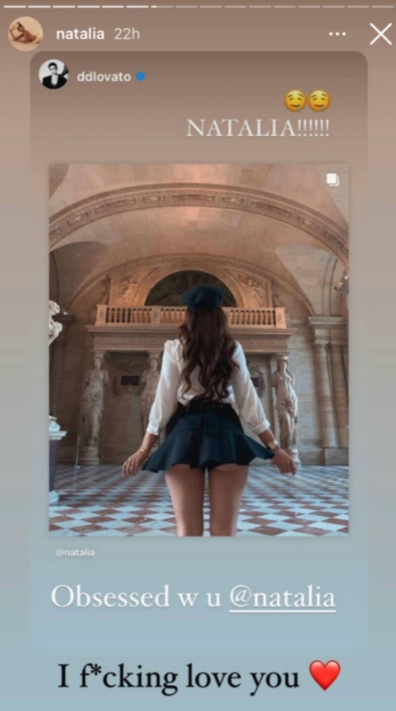 No solo quedó en el comentario, sino que la ex estrella de Disney, compartió la misma fotografía de Natalia Barulich en sus Instagram Stories, en la que además escribió: "Obsesionada contigo @natalia. Te amo jodidamente".