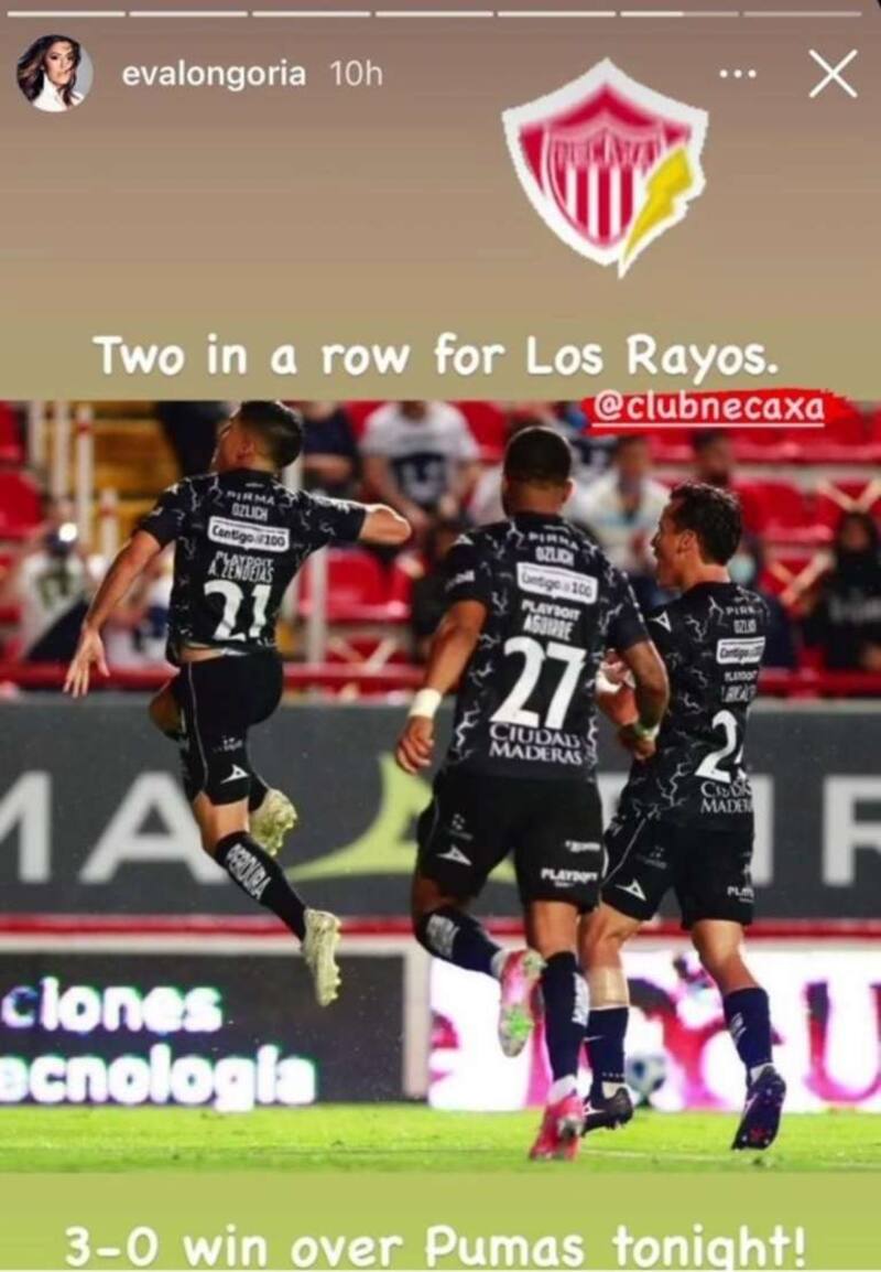 La actriz estadounidense Eva Longoria, protagonista de la serie "Esposas desesperadas", celebró el triunfo del equipo mexicano de futbol Necaxa sobre los Pumas con un marcador 3-0. El encuentro, concerniente a la jornada 3 del torneo de Apertura 2021, se realizó la noche del martes en el Estadio Victoria de Aguascalientes.