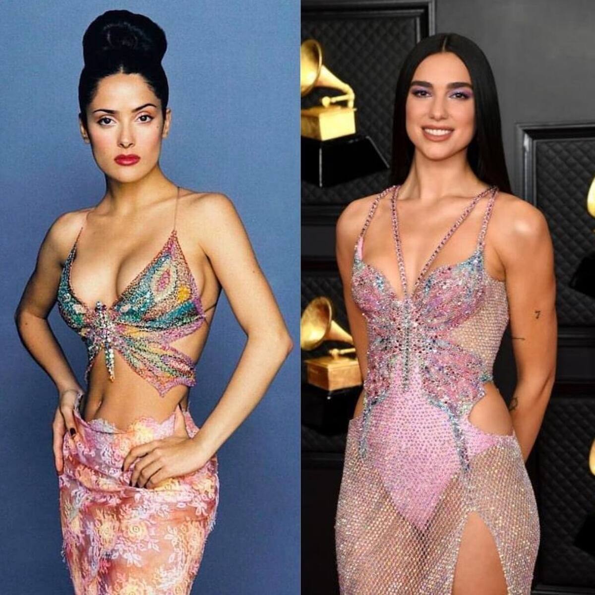 Para los Grammy de 2021, Dua Lipa uso un vestido largo ceñido con transparencias con una sutil red y con miles de cristales en tonalidades rosadas en corte mariposa, muy semejante a un diseño que Salma Hayek uso hace varios años.