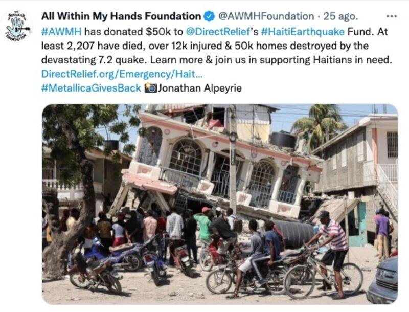 Metallica donó 50 mil dólares a un fondo de ayuda a los afectados por el terremoto del 14 de agosto, que dejó 2 mil 207 personas muertas en Haití, a través de su fundación All Within My Hands.