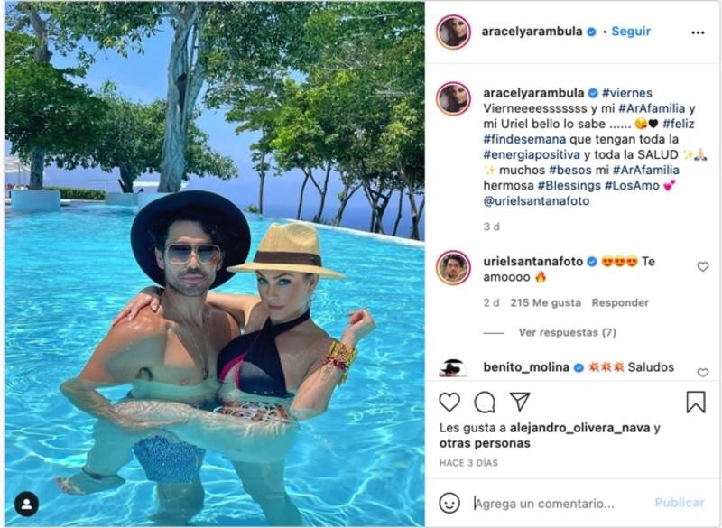 La fotografía, que podría evidenciar al que sería el nuevo amor de Aracely Arámbula, fue acompañada de unas palabras de afecto por parte de la actriz de melodramas: "#viernes Vierneeeesssssss y mi #ArAfamilia y mi Uriel bello lo sabe ... #feliz #findesemana que tengan toda la #energiapositiva y toda la SALUD muchos #besos mi #ArAfamilia hermosa #Blessings #LosAmo".