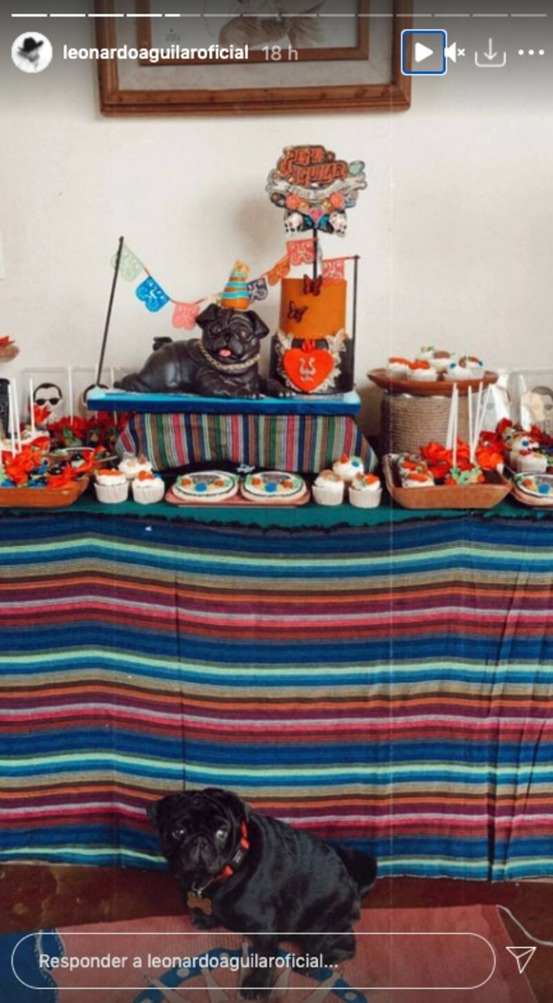 A través de sus Instagram Stories, sus hijos Aneliz y Leonardo Aguilar, se vio que el cantante disfrutó su fiesta con temática inspirada en su perro de raza pug, llamado "Gordo", pues hubo pastel y mesa de dulces que se parecían a el adorable canino.