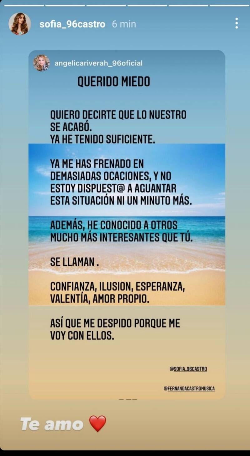 "Querido miedo: Quiero decirte que lo nuestro se acabó. Ya he tenido suficiente. Ya me has frenado en demasiadas ocasiones, y no estoy dispuesta a aguantar esta situación ni un minuto más. Además, he conocido a otros mucho más interesantes que tú. Se llaman confianza, ilusión, esperanza, valentía, amor propio. Así que me despido porque me voy con ellos", publicó.