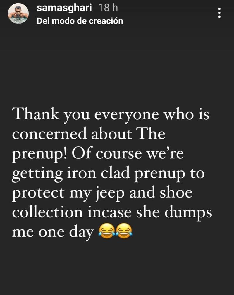 "¡Gracias a todos los que están preocupados por el acuerdo prenupcial!, por supuesto, vamos a conseguir un acuerdo prenupcial revestido de hierro para proteger mi jeep y mi colección de zapatos en caso de que ella me deje algún día", publicó Asghari junto a algunos emojis de risa.
