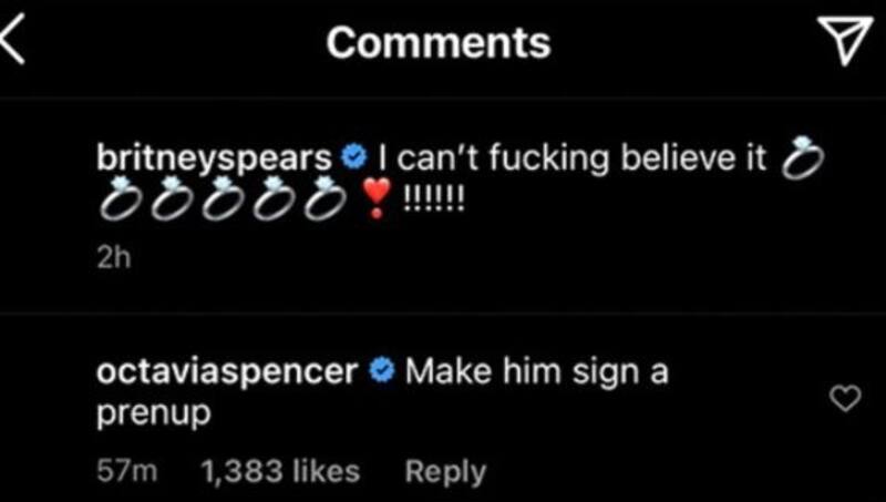 La cantante Britney Spears anunció su compromiso con el modelo Sam Asghari en redes sociales, tras postear una foto presumiendo su sortija, la cual tiene un precio de 70 mil dólares. Las felicitaciones le llovieron. Sin embargo, la actriz y ganadora del "Oscar" Octavia Spencer dejó un comentario en la publicación que desató una gran polémica.