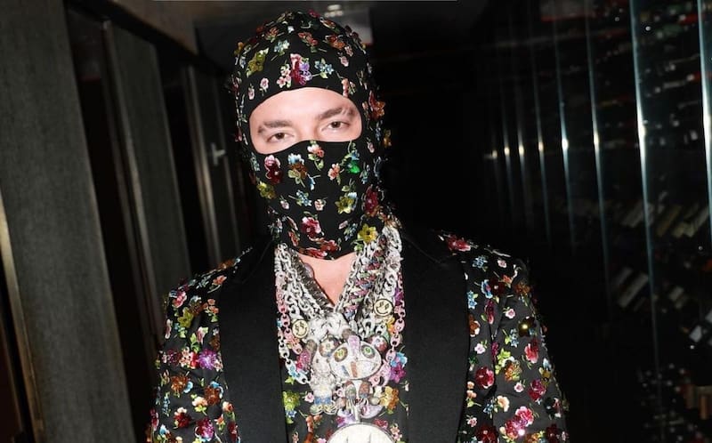 Para acompañar su colorido estilismo floral, J Balvin llevó un pasamontañas con el mismo estampado, así como un gran número de cadenas sujetadas de su cuello de diferentes tamaños, que además tenían diversos dijes, como el logo de carita del colombiano.