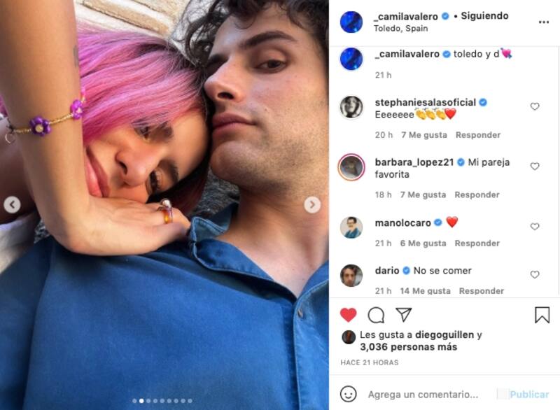 En la fotografía en cuestión, Camila Valero aparece recargada sobre el hombro de Darío Yazbek, junto con una gran sonrisa, y a propósito, escribió: "toledo y d", pues la galería fue capturada durante su estancia en Toledo, España.