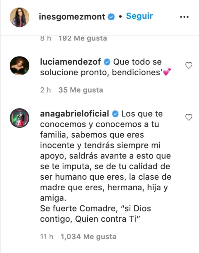 Diversos famosos y colegas de Inés Gómez Mont, han comentado la publicación, entre ellos, Ana Gabriel, Lucía Méndez, Maribel Guardia, Sandra Echeverría, Andrea Noli, Mauricio Mancera y más.