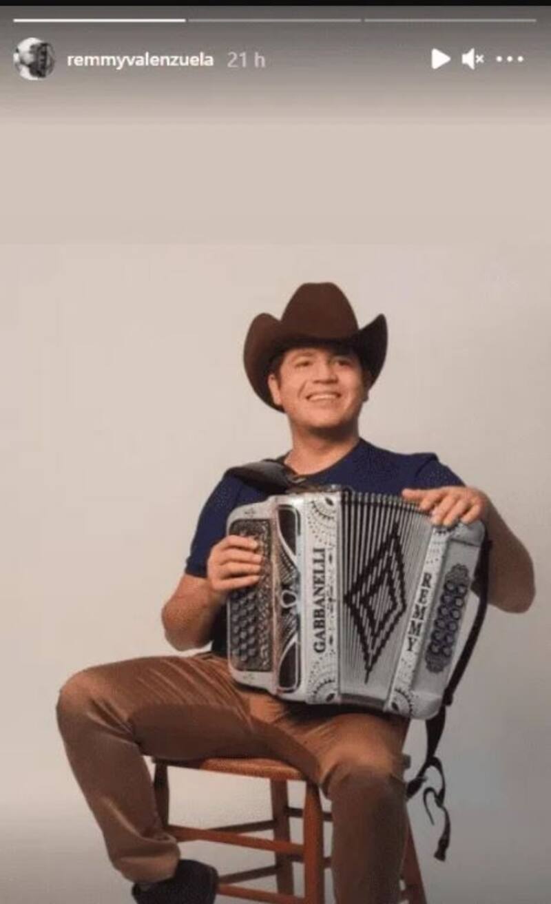 El cantante de regional mexicano publicó a través de sus historias de Instagram una fotografía en la que se le puede ver sentado en un banco usando un pantalón café, una playera azul oscuro y su sombrero texano, además de su inseparable acordeón.