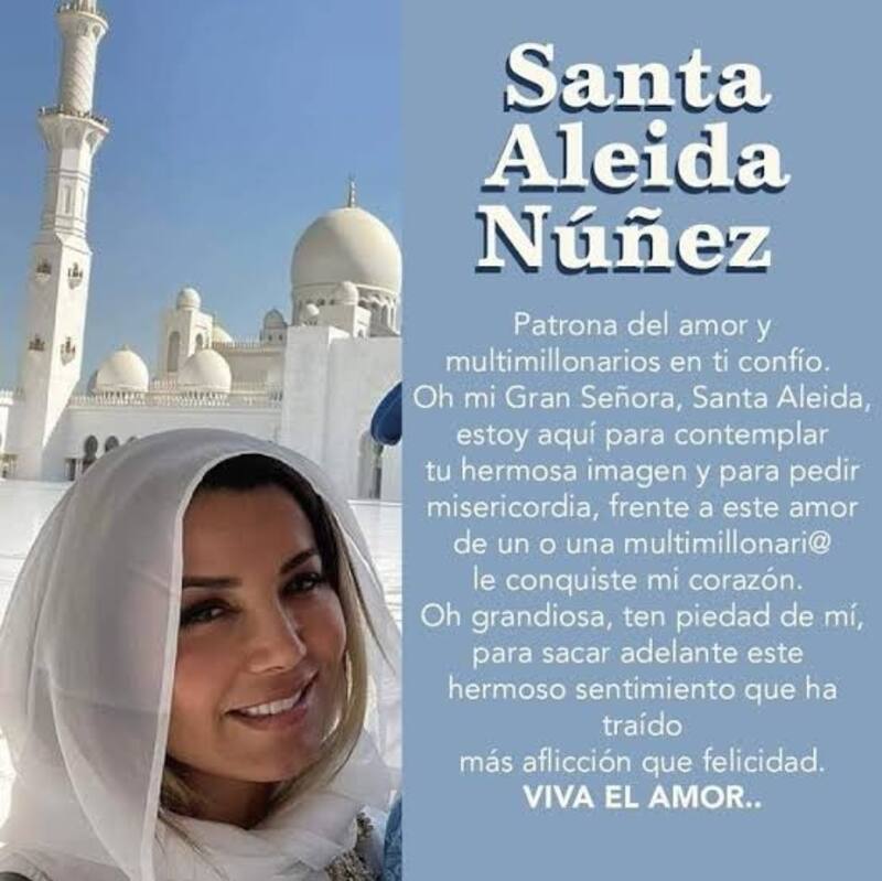 Tras dar a conocer su nueva relación con el millonario Bubba Saulsbury, la actriz Aleida Núñez ha tomado un nuevo estatus ante los ojos de los cibernautas, que ahora la han denominado la nueva "Santa del amor".