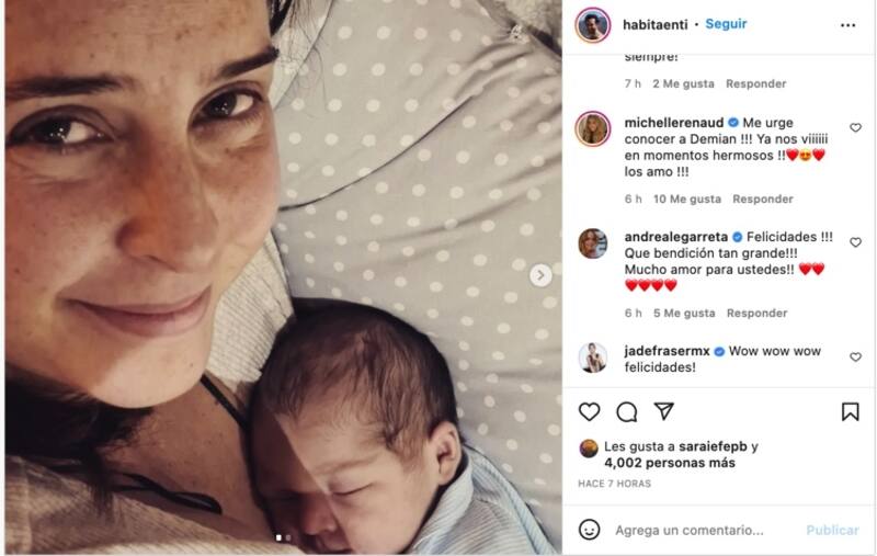 Ante estas encantadoras fotografías varias famosas no dudaron en felicitar a la feliz mamá, Michelle Renaud comentó: "Me urge conocer a Demian, Ya nos viiiiii en momentos hermosos, los amo", comentó la actriz. Mientras qué la conductora de "Hoy", Andrea Legarreta, escribió: "Felicidades, Que bendición tan grande!!! Mucho amor para ustedes".
