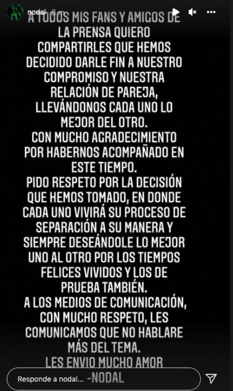 En la misma publicación, Christian Nodal pidió a los medios de comunicación respeto ante la ruptura: "A los medios de comunicación, con mucho respeto, les comunicamos que no hablaré más del tema. Les envío mucho amor - Nodal".