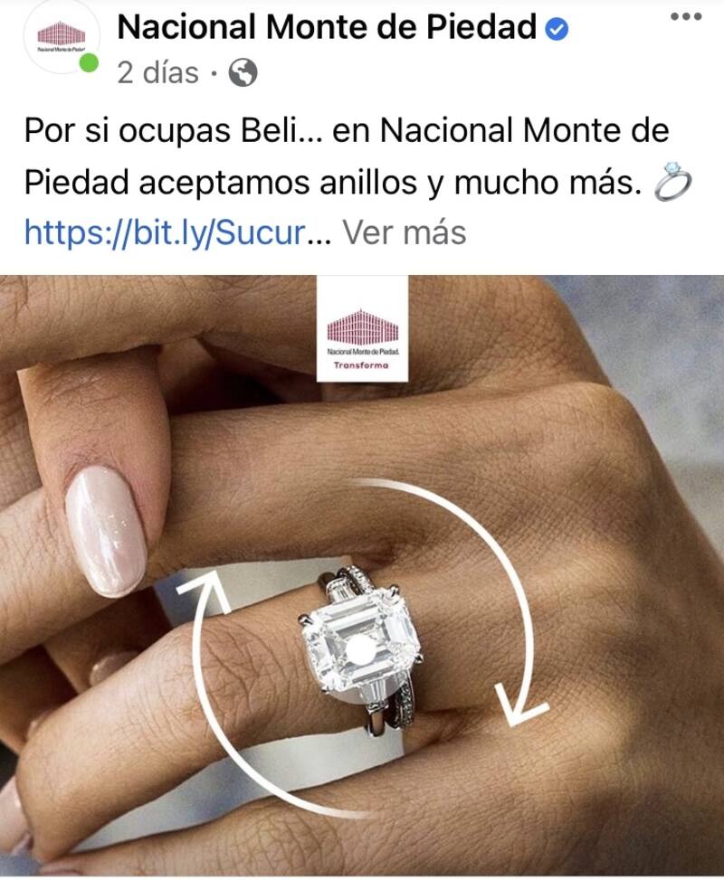 "Por si ocupas Beli…en Nacional Monte de piedad aceptamos anillos y mucho más", escribió Nacional Monte de Piedad, que incluyó como hashtag la famosa frase de "Ganando como siempre".