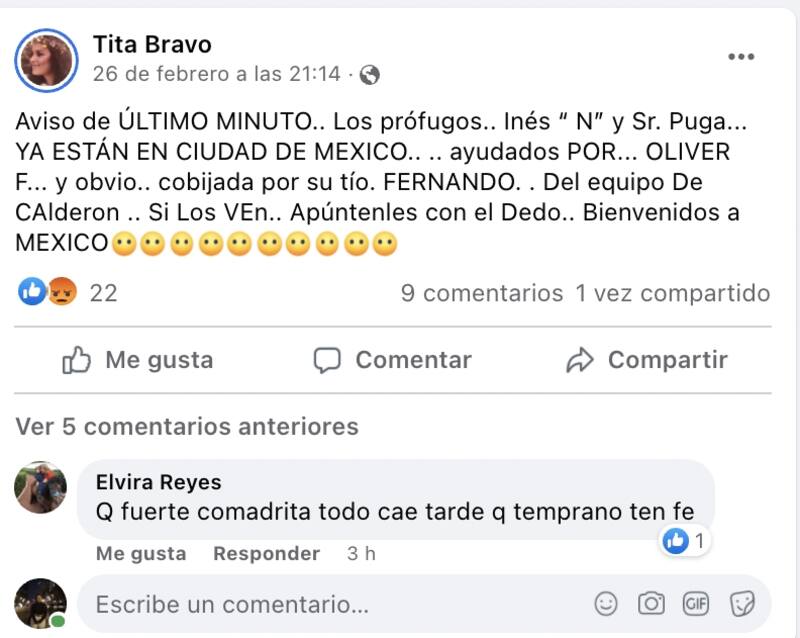 "Aviso de último minuto. Los prófugos Inés y Sr. Puga ya están en Ciudad de México ayudados por Oliver F y obvio cobijada por su tío Fernando del equipo De Calderón. Si Los ven Apúntenles con el Dedo.. Bienvenidos a México", comentó la ex-suegra de Gómez Mont en una publicación en su Facebook .