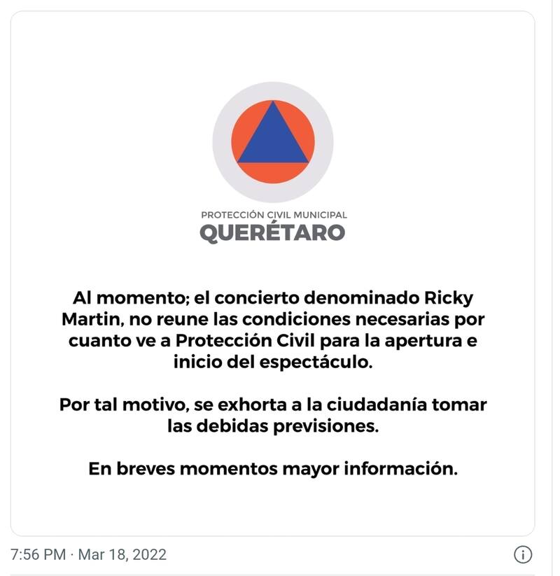 La promotora del evento emitió un comunicado en el que respeta la decisión de las autoridades de Protecció Civil y anunció que devolverá el dinero de los boletos a los asistentes, quienes habían esperado por ver a Ricky Martin dos años, tras cancelarse por la pandemia de coronavirus.