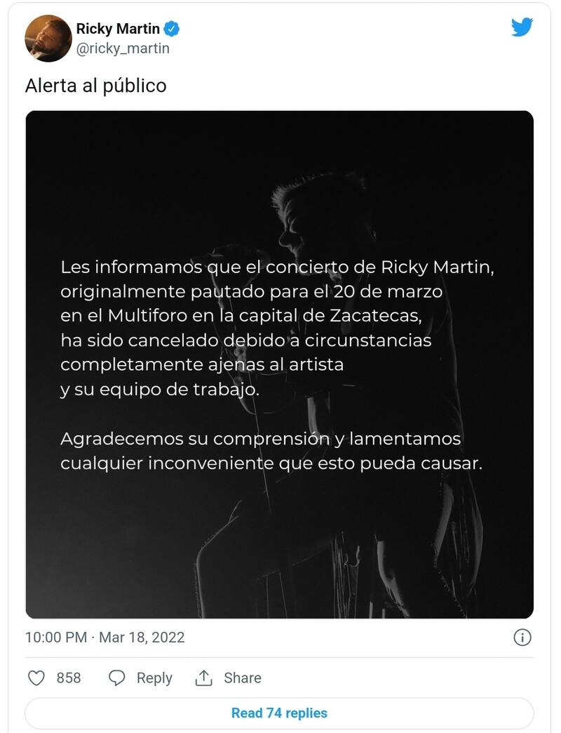 Hasta el momento Ricky Martin no ha emitido comentario sobre lo ocurrido en Querétaro. En sus redes sociales únicamente dio a conocer que el concierto anunciado el próximo 20 de marzo en el Multiforo de Zacatecas también fue cancelado "por motivos ajenos al artista".