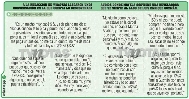 En los presuntos audios, Mayela Laguna asegura que ella se encarga de la pizzería que abrió junto al hermano de Alejandra Guzmán, ella es quien la trabaja y no recibe un sueldo y supuestamente no baja de "macho" a su pareja, sintiéndose una esclava y "peor que en la cárcel".