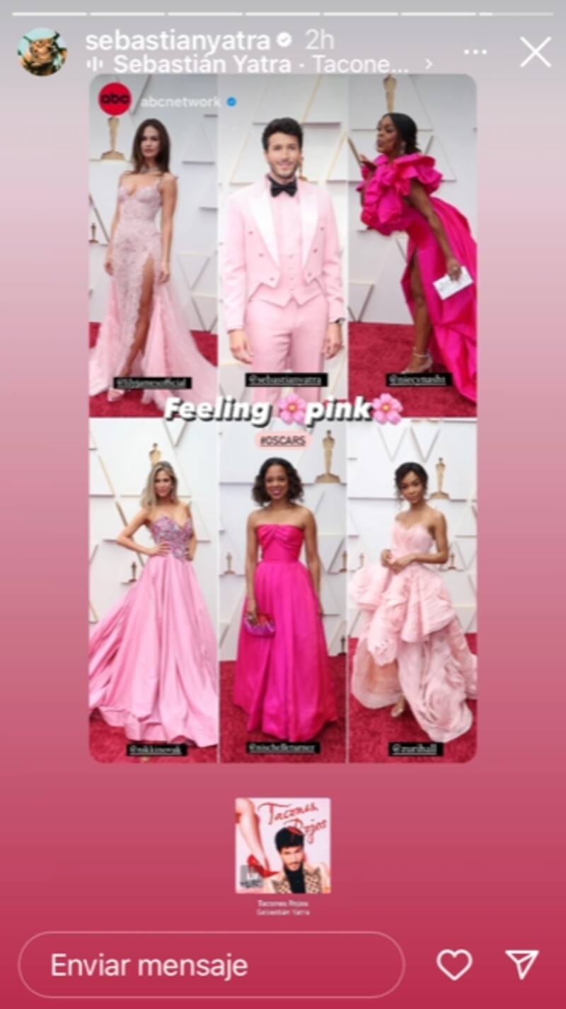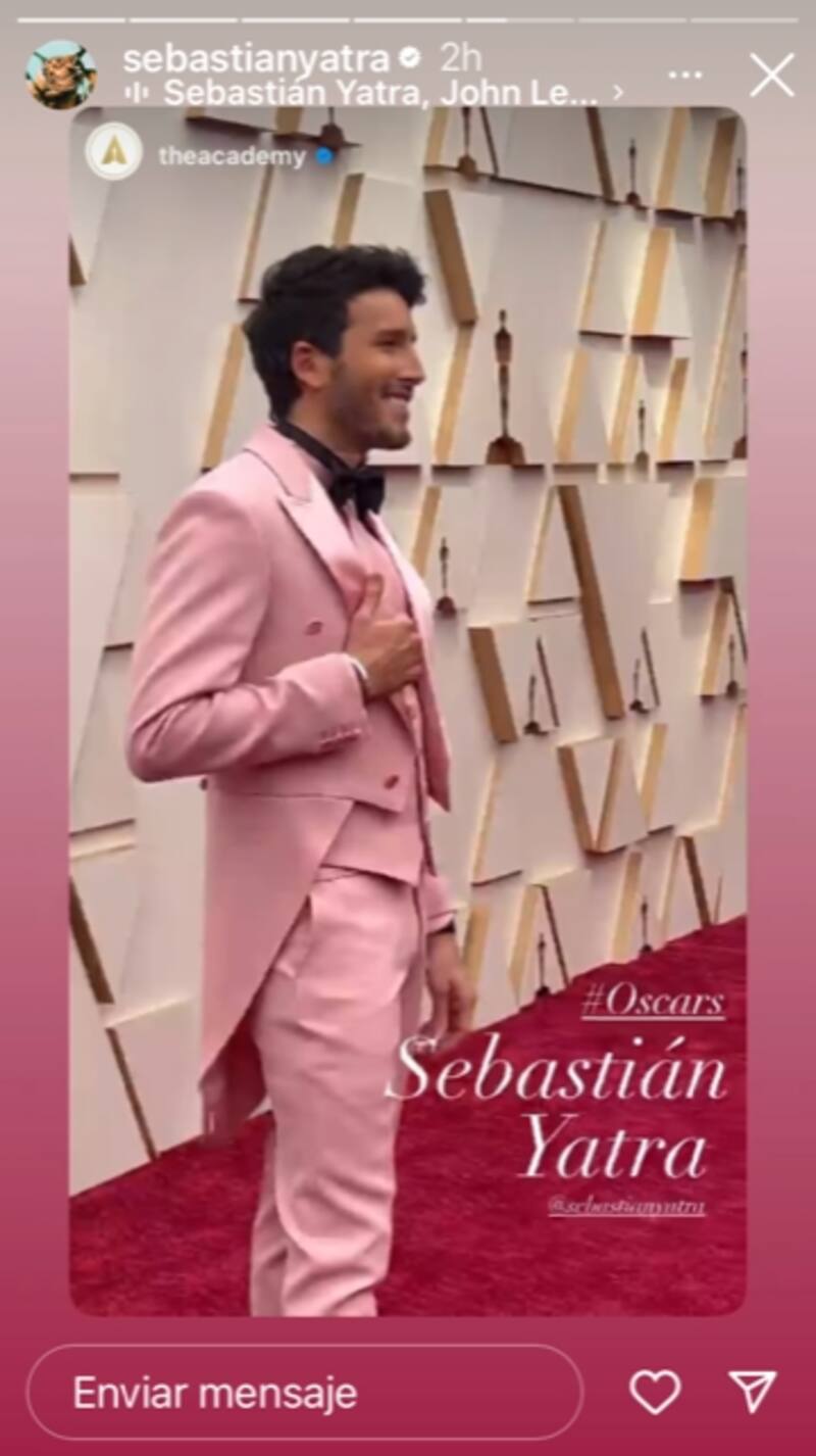 Desde el primer momento de su arribo a la premiación de los Oscar, Sebastián Yatra robó las miradas con un elegante traje rosa hecho de la marca Moschino, cuyo color estuvo en tendencia, pues varias celebridades lo lucieron.