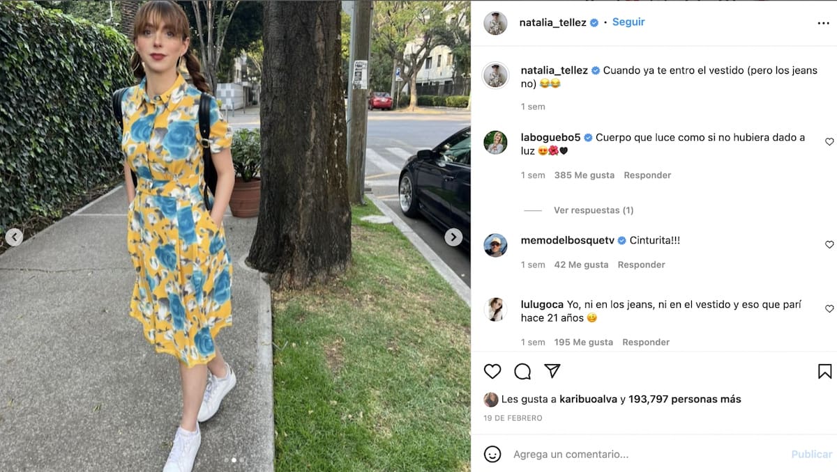Está no es la primera vez que Natalia Téllez muestra su figura después de haber dado a luz. En una de sus publicaciones hizo referencias de que había subido de peso en el embarazo: "Cuando ya te entró el vestido (pero los jeans no)", escribió en la publicación.