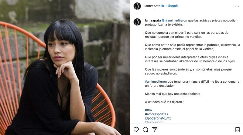 Y continuó: "Que como actriz sólo podía representar la pobreza, el servicio, la violencia (siempre desde el papel de la víctima). Que por ser mujer debía interpretar a otras cuyas vidas e intereses se centraban alrededor de un hombre o de los hijos. Que las mujeres son pendejas y, si son prietas, más porque seguro no estudiaron. #amimedijeron que tener una infancia difícil me iba a condenar a un futuro desolador".