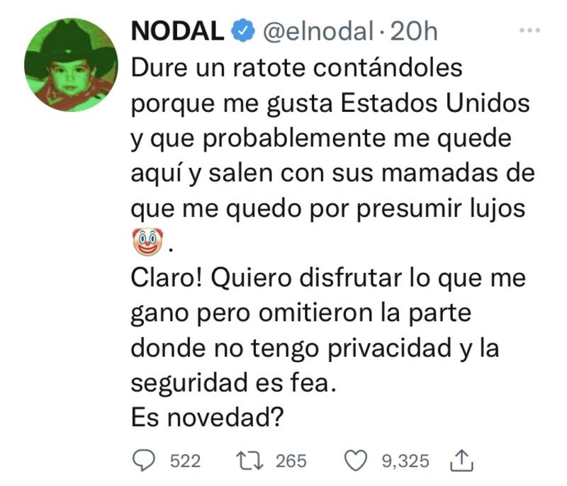 Hace unos días Christian Nodal compartió con sus seguidores una interesante reflexión sobre los motivos por los que estaba pensando en radicar en Estados Unidos, uno de ellos fue la inseguridad que prevalece en el país y el otro que a últimas fechas su nivel de vida se va vuelto un foco de atención, lo cual no le gusta.