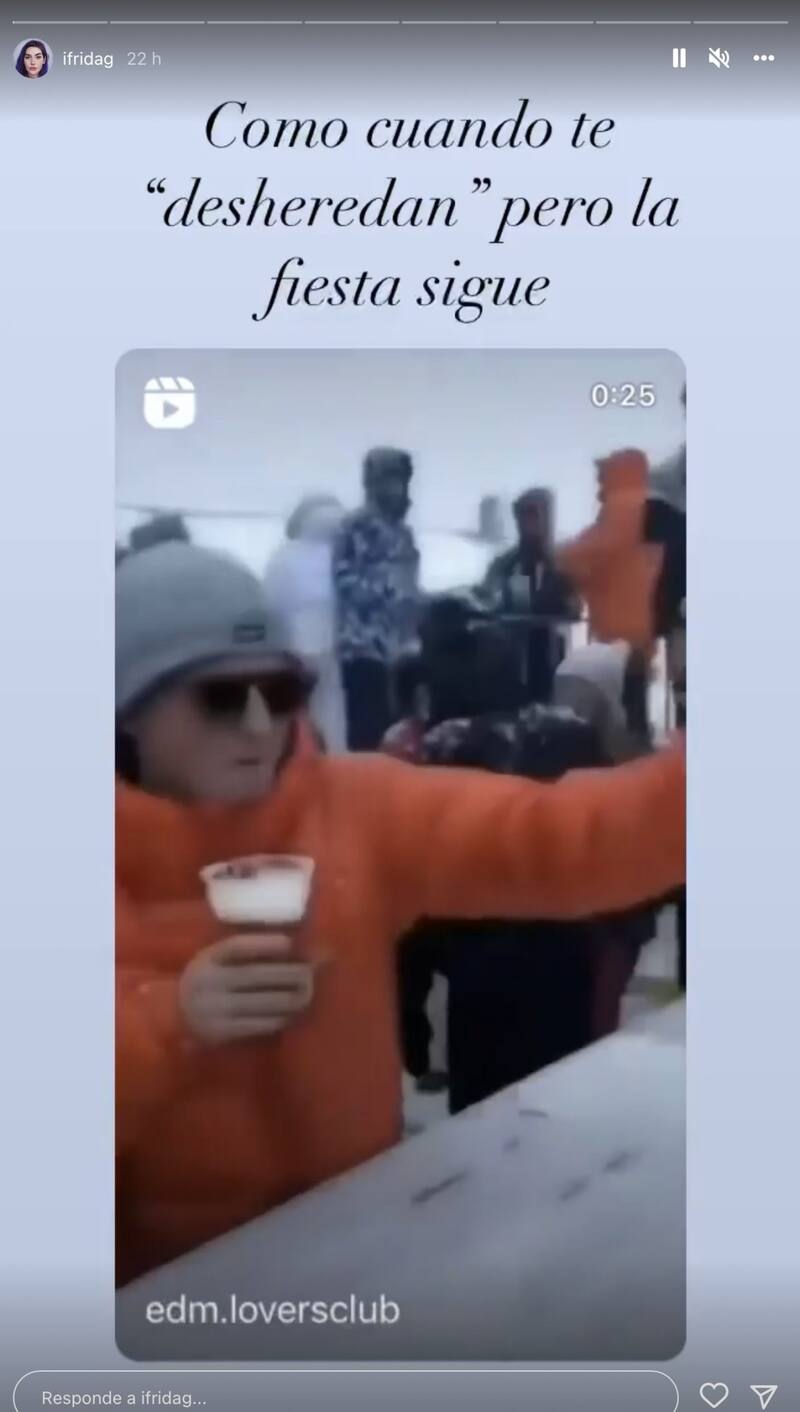 La joven cantante publicó en sus historias de Instagram un video donde aparece un hombre disfrutando de una celebración en la nieve con la siguiente frase: "Como cuando te 'desheredan' pero la fiesta sigue".