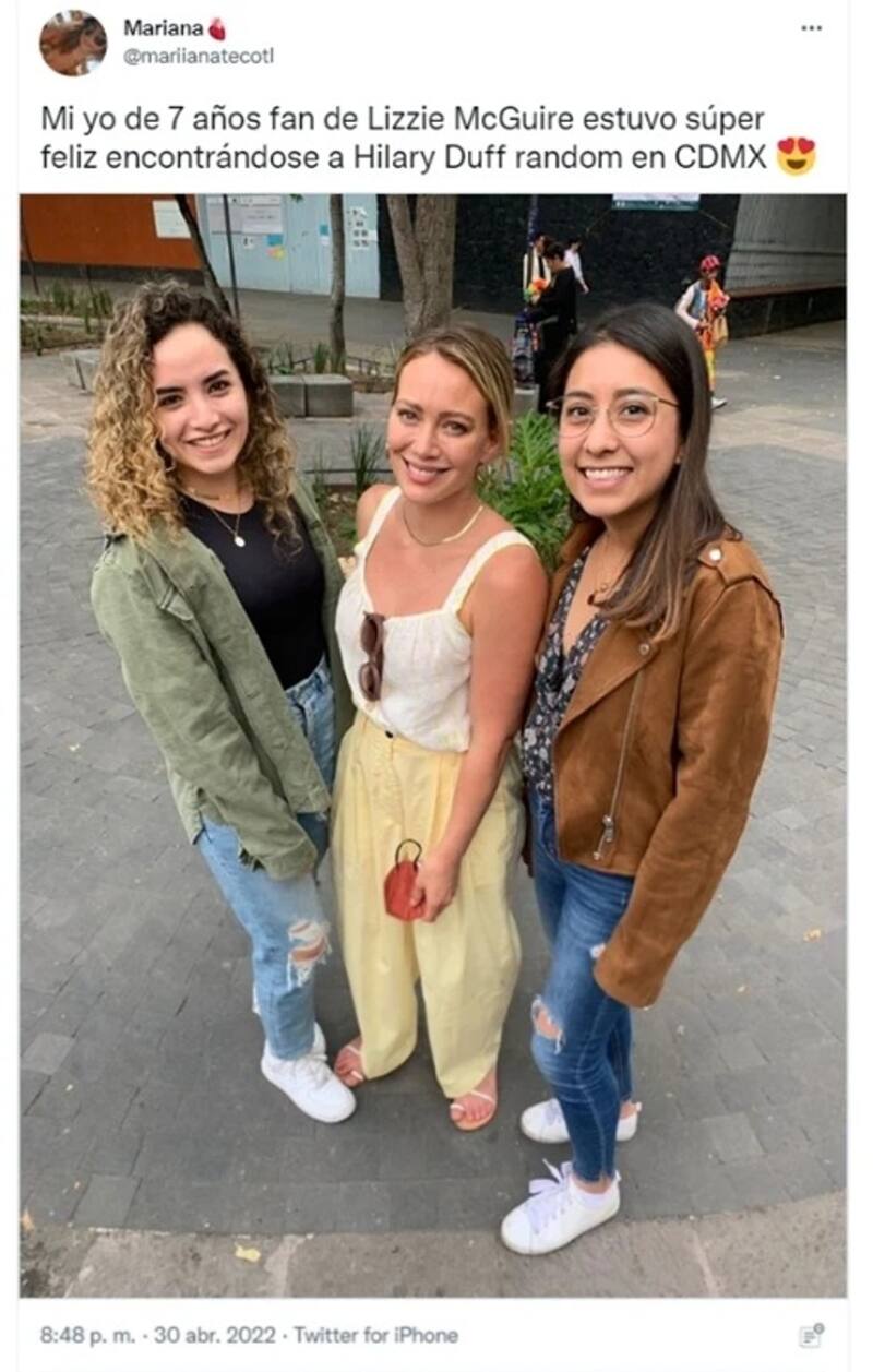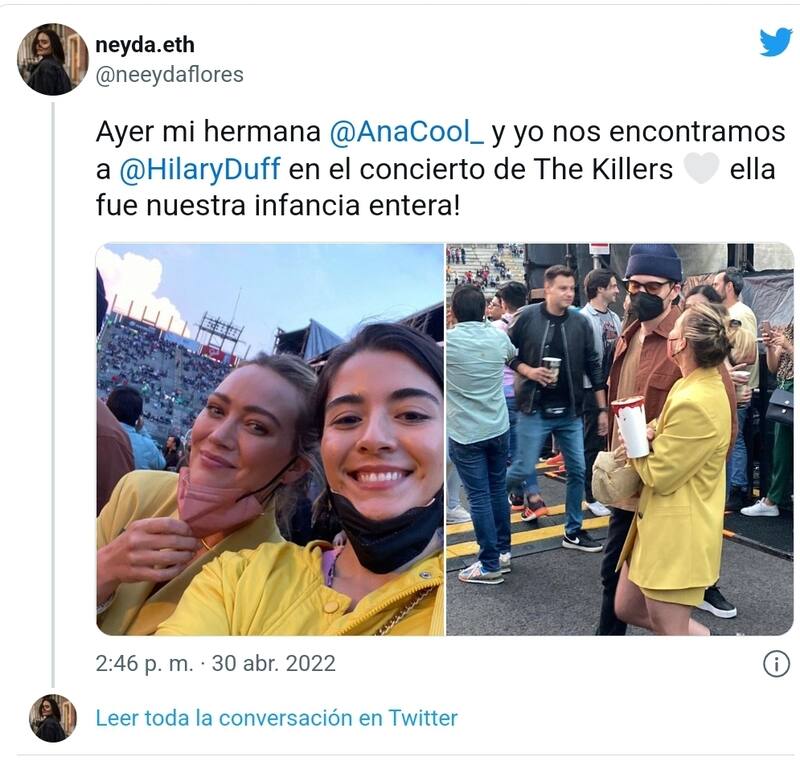 Una usuaria (@neeydaflores) de Twitter mostró la fotografía que se logró tomar con la protagonista de la emblemática serie "Lizzie McGuire", personaje que la catapultó a la fama. "Ayer mi hermana y yo nos encontramos a Hilary Duff en el concierto de The Killers; ella fue nuestra infancia entera!".