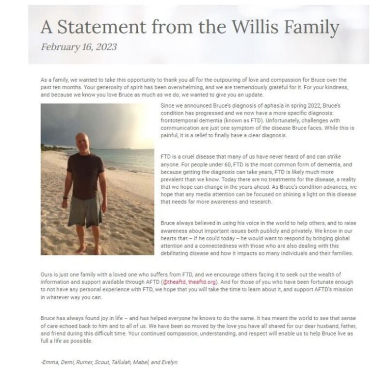 “Desde que anunciamos el diagnóstico de afasia de Bruce en la primavera de 2022, la condición de Bruce ha progresado y ahora tenemos un diagnóstico más específico: demencia frontotemporal. Desafortunadamente, los desafíos con la comunicación son solo un síntoma de la enfermedad que enfrenta Bruce. Aunque esto es doloroso, es un alivio tener finalmente un diagnóstico claro”.