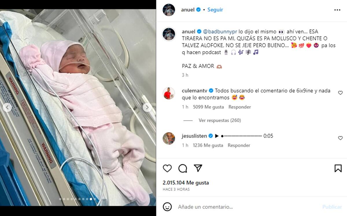 “ESA TIRAERA NO ES PA MI, QUIZÁS ES PA MOLUSCO Y CHENTE O TALVEZ ALOFOKE, NO SE JEJE PERO BUENO… pa’ los q hacen podcast (sic)”, escribió Anuel en el carrusel de fotos donde aparece la foto de la niña.