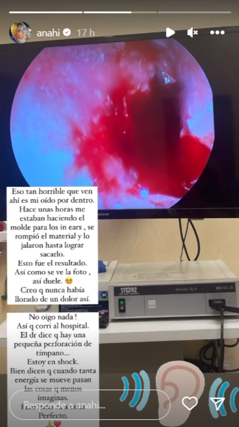 Anahí preocupó a sus seguidores, luego que sufriera una rotura de tímpano cuando le hacían los moldes de los audífonos que usará en la gira. De acuerdo con su médico, la persona que hizo el procedimiento lastimó el oído de la artista e incluso se lo dejó en carne viva.