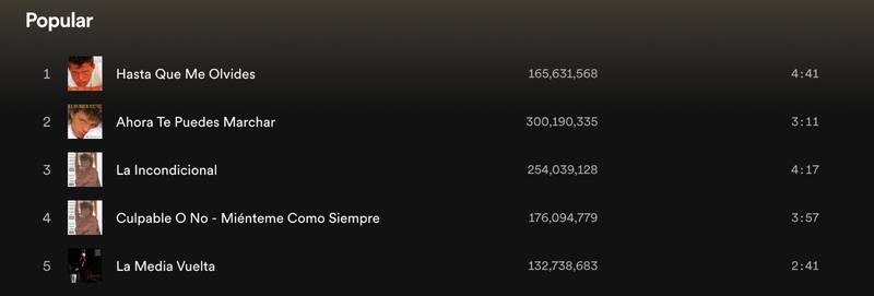 De acuerdo a la plataforma de música, el éxito más reproducido de Luis Miguel es la canción "Ahora te puedes marchar" de 1987, que hasta el momento cuenta con 300,190,335 reproducciones, y según la revista "Quien" ha generado ganancias de más de 365 mil dólares.
