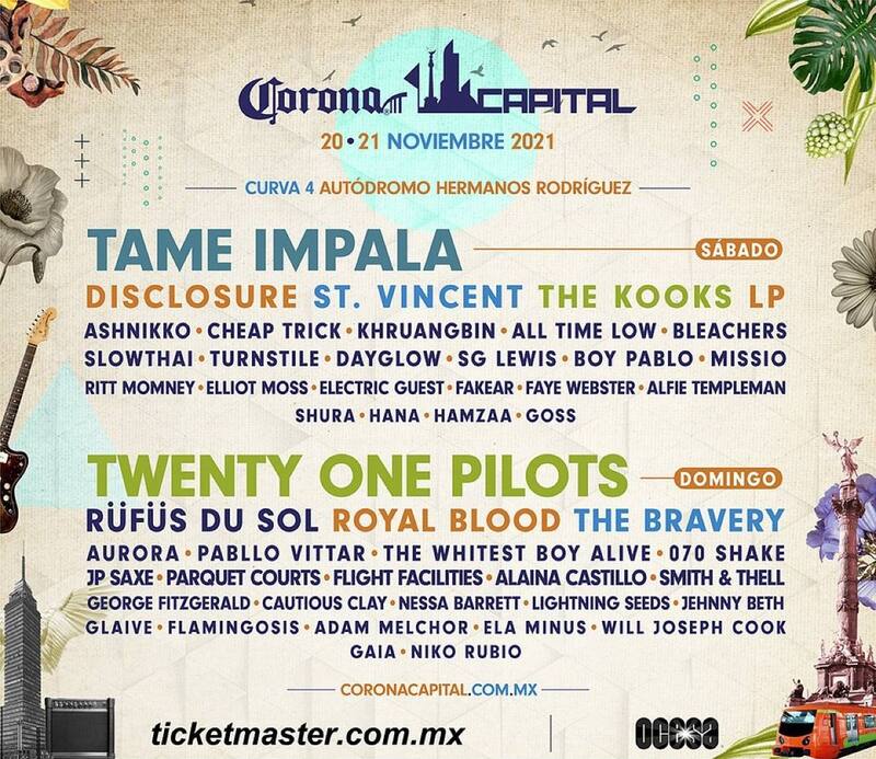 El lineup del Corona Capital incluye a Tame Impala, Twenty One Pilots, Disclosure, Rüfüs du Sol, St. Vincent, LP, The Kooks, Cheap Trick, The Whitest Boy Alive, Pabllo Vittar y muchos más. Además se vivirá la primera actuación musical en México de Royal Blood, Ashnikko, JP Saxe, 070 Shake, Turnstile, Dayglow, Missio y Alaina Castillo, entre otros. También, contará con el primer show de vuelta a nivel mundial de The Bravery, después de 9 años sin tocar.