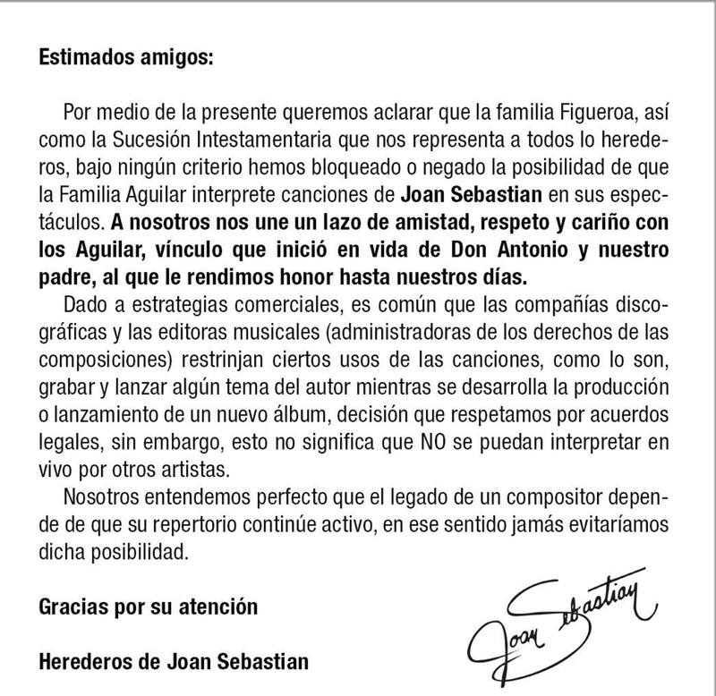 A través de un comunicado en la cuenta de Instagram del fallecido cantautor, sus herederos afirmaron que, lejos de tener una enemistad con la familia de Pepe Aguilar, continúan con el lazo de respeto y cariño que comenzó con Antonio Aguilar y José Manuel Figueroa Figueroa, conocido como Joan Sebastian.