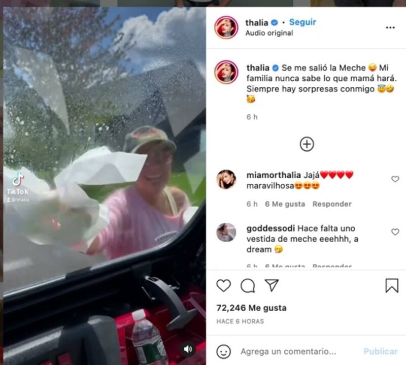"Me salió la Meche. Mi familia nunca sabe lo que mamá hará. Siempre hay sorpresas conmigo", escribió Thalía en el video que ya tiene más de 70 mil reproducciones en Instagram.