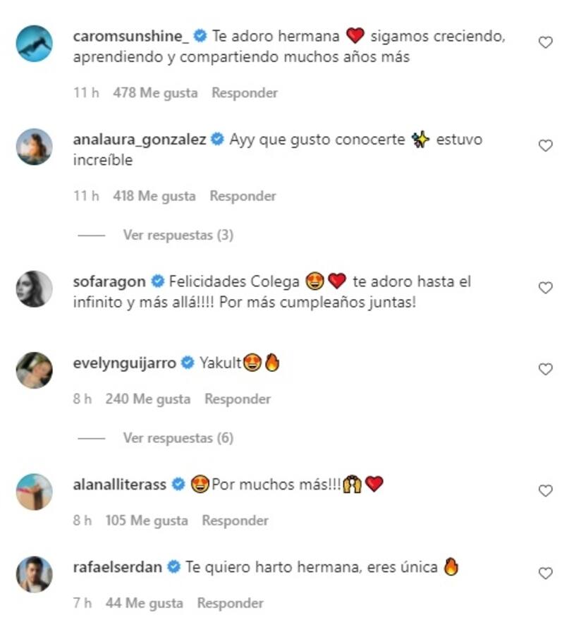 "Te adoro hermana. Sigamos creciendo, aprendiendo y compartiendo muchos años más", escribió Caro "Sunshine" Mendoza, mientras que Evelyn Guijarro comentó: "Yakult". "Ay, qué gusto conocerte. Estuvo increíble", aseguró Ana Laura González.
