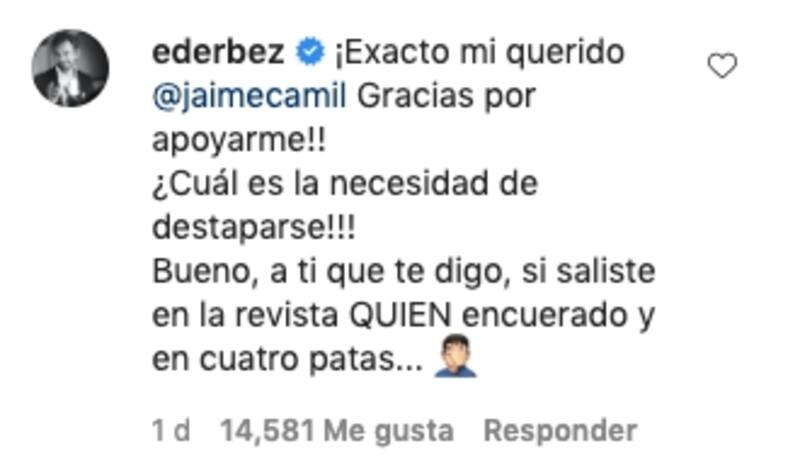 Por si no fuera poco, el actor Jaime Camil también se unió a la conversación y comentó: "No sólo te va a juzgar mi hermanito @ederbez, yo también, en mi papel de Padre (de familia, no de iglesia) te voy a estar pidiendo que te me andes tapando por favor 🤦🏽♂️", y Eugenio Derbez comentó lo siguiente: