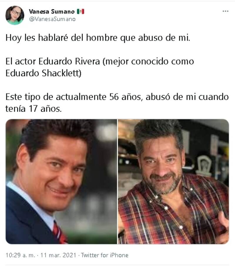 Eduardo Rivera, mejor conocido como Eduardo Shacklett, fue denunciado en Twitter por Vanesa Sumano, de haber sido victima de abuso por parte del actor cuando era menor de edad.