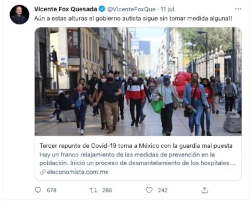 El domingo pasado, el expresidente Vicente Fox Quesada fue criticado por utilizar el concepto "autista" para referirse al gobierno mexicano encabezado por Andrés Manuel López Obrador. En su cuenta de Twitter compartió una nota del periódico "El Economista" en la que se ve gente caminando en el Centro Histórico de la Ciudad en tiempos de Covid-19, y apuntó: