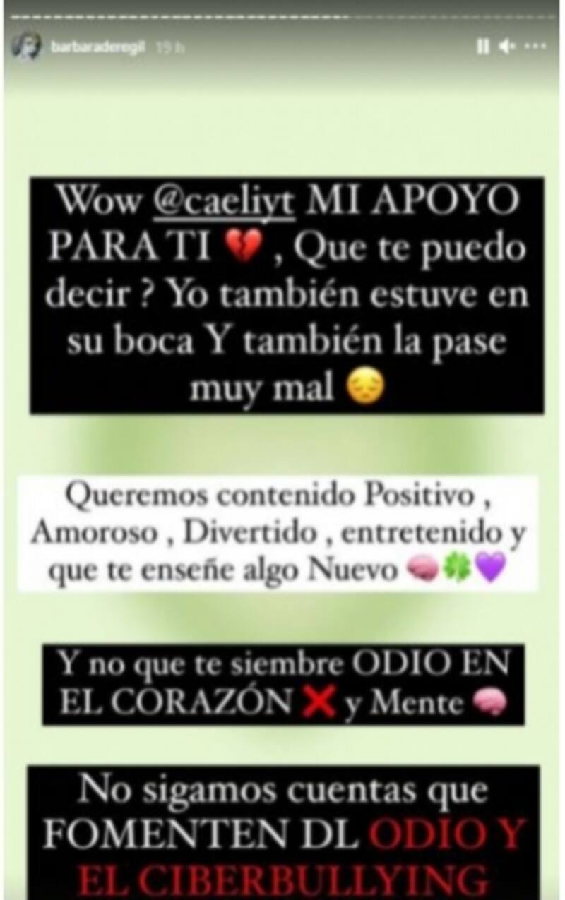 A través de sus historias en Instagram, Bárbara de Regil externó que, al igual que Caeli, también fue víctima de YosStop, por lo que pidió detener el cyberbullying.