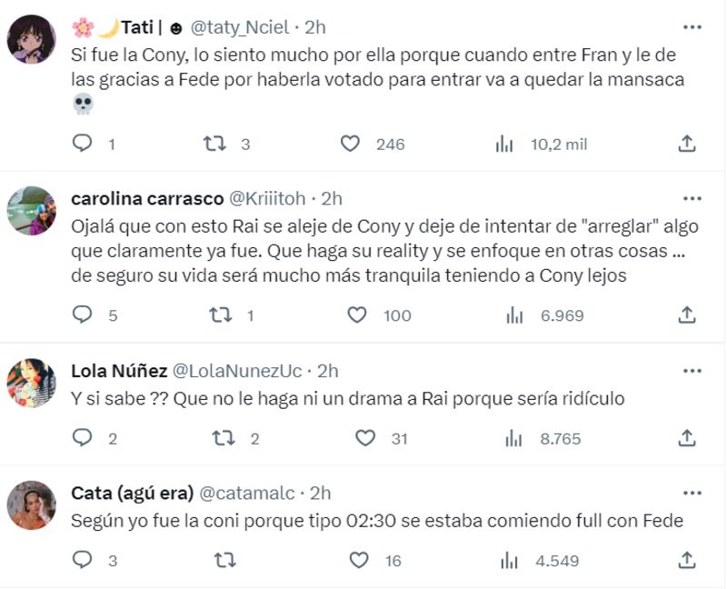 Incluso, hubo algunos que aseguraron que “fue la Coni porque tipo 02:30 se estaba comiendo full con Fede”, así como también que “Ojalá que con esto Rai se aleje de Coni y deje de intentar de arreglar algo que claramente ya fue”.