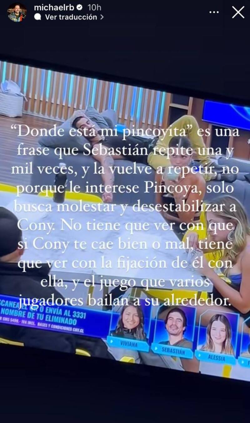 “‘¿Dónde está mi Pincoyita?’ Es una frase que Sebastián repite una y mil veces y la vuelve a repetir, no porque le interese Pincoya, solo busca molestar y desestabilizar a Coni”, fue claro en señalar Michael Roldán.