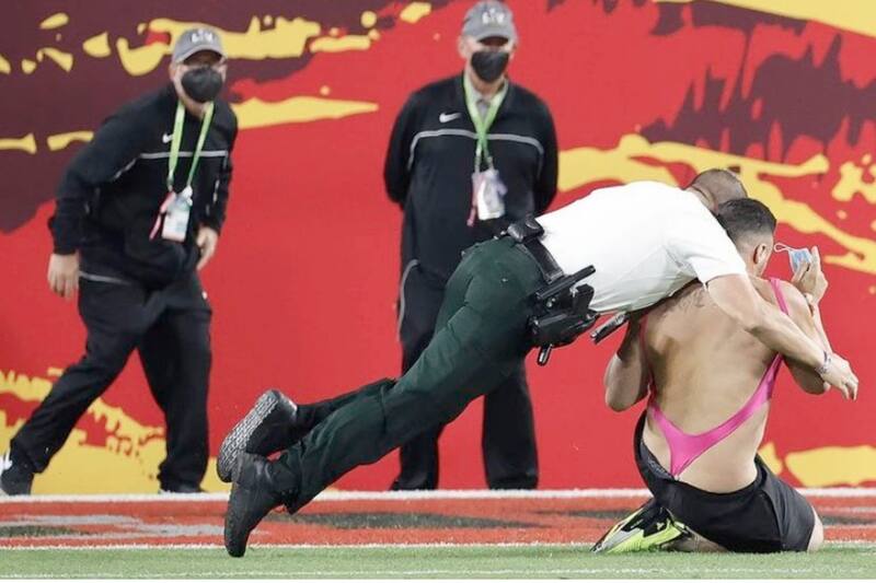 Durante el partido por el Super Bowl LV, en el que los Tampa Bay Buccaneers vapulearon 31-9 a los Kansas City Chiefs, un hombre se metió al campo y detuvo las acciones.